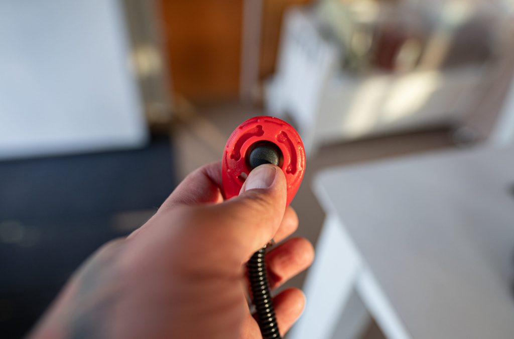 ご褒美と同時に、クリッカーも正の強化に活用するツールです。ご褒美だけでは、与えるまでにどうしてもタイムラグが生じてしまいます。しかし、クリッカーの「カチッ」という音は、どんな行動をしていてもすぐに鳴らすことができます。